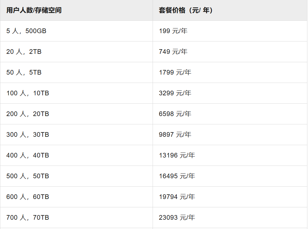 阿里云网盘企业版采用“存储空间+用户数”双维度定价模式,覆盖从初创团队到大型集团的全场景需求。2025年基础套餐起售价为199元/年(500GB存储+5用户),企业可以根据需求进行扩容。具体价格如下: