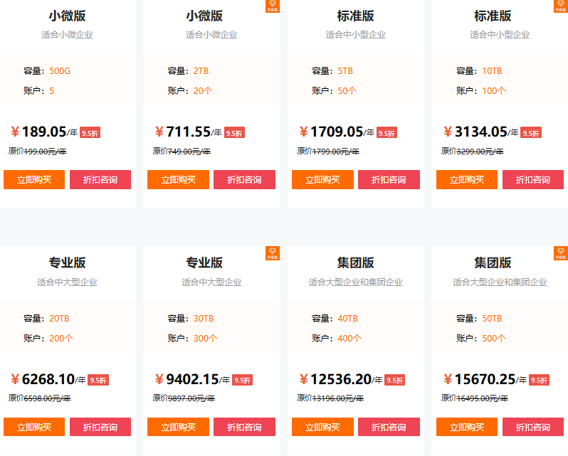 4、旗舰套餐:100–1000用户,10 TB–100 TB,年费3299–32990元