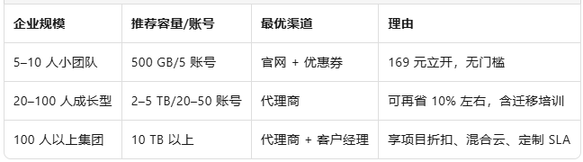 ·折扣空间:标准套餐通常可再下浮8%–25%,大项目(>50TB 或 >500 账号)一事一议