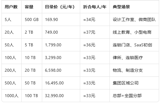 阿里云企业网盘费用是多少?阿里云企业网盘提供多种套餐供大家选择,最低500GB+5用户,价格为169.9元/年。已下是阿里云企业网盘价格查询: