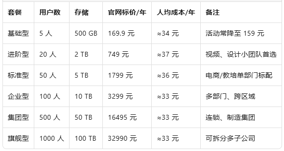 纯办公文档、钉钉审批附件→500 GB/5人可撑30人以下小微公司;