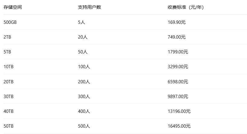 阿里云企业网盘采用按年付费模式,价格主要根据存储空间和支持的用户数量两个维度确定。最低价格为169.9元一年。以下是2025年最新的详细价格信息: