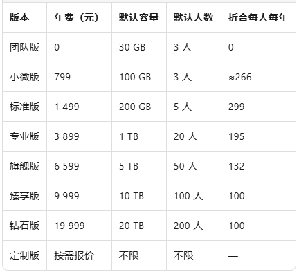 3、定制版通常起步50 TB容量、500账号,成交区间3–10万元/年,需单谈。