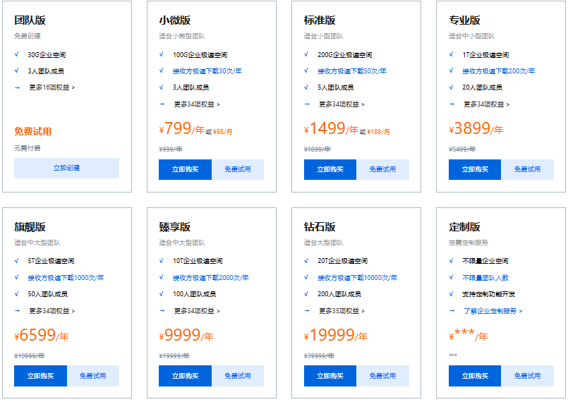 企业百度云盘一年多少钱?百度企业网盘采用「按年付费+阶梯降价」模式,共8档套餐,从3人小团队到万人级集团均可匹配。以下是最新的百度企业网盘价格表: